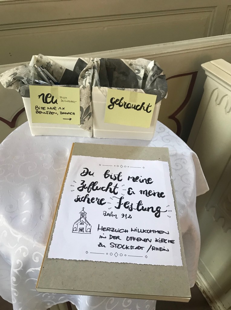 Die evangelische Kirche in Stockstadt ist ein guter Ort zu Corona-Zeiten. Alleine oder mit dem eigenen Lebenspartner oder Kind darf man unterwegs sein und darum ist das altehrwürdige Gotteshaus in der Ortsmitte tagsüber offen. Dort kann man ganz für sich allein innehalten, Sorgen vor Gott bringen oder eine Kerze anzünden. Auch ein Buch liegt bereit, in das man seine Bitten oder Gedanken eintragen kann. Geöffnet ist die Kirche von 9 Uhr bis 17:30 Uhr. Werktags um 17 Uhr kommt Pfarrerin Auksutat für ein Abendgebet in die Kirche. Diese kurze Andacht wird auf facebook live übertragen und kann auf der Website der Kirchengemeinde auch nachträglich angeschaut werden.
